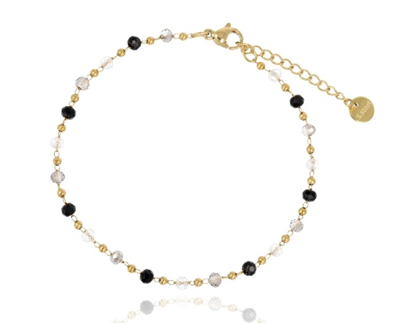 Bransoleta wykonana z naturalnych kamieni onyksu i kryształu górskiego, osadzonych na trwałej stali szlachetnej 316L. Drobne koraliki o średnicy 2–3 mm tworzą minimalistyczną, elegancką kompozycję, która świetnie sprawdza się zarówno w codziennych zestawach, jak i w bardziej klasycznych stylizacjach.