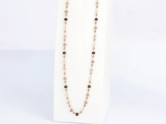 Naszyjnik wykonany z naturalnych kamieni: ametystu, kwarcu różowego i kryształu górskiego, ułożonych w drobne, delikatne koraliki przeplatane złotymi kuleczkami ze stali szlachetnej 316L. Subtelny, minimalistyczny i odpowiedni zarówno do codziennych stylizacji, jak i bardziej eleganckich zestawów.