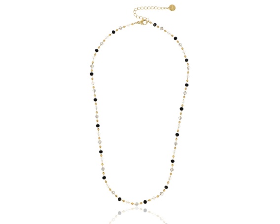 Naszyjnik wykonany z naturalnych kamieni onyksu i kryształu górskiego, ułożonych w drobne, delikatne koraliki przeplatane złotymi kuleczkami ze stali szlachetnej 316L. Subtelny, minimalistyczny i odpowiedni do codziennych stylizacji oraz bardziej eleganckich zestawów.